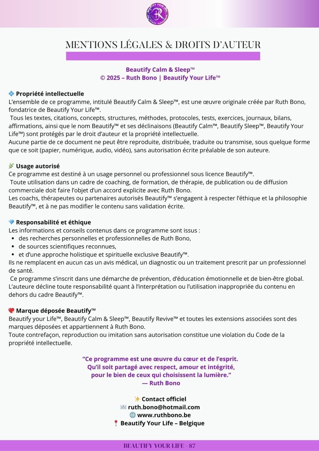 Chaque page a été pensée comme une séance à part entière, avec la profondeur, la bienveillance et la précision d’un vrai suivi thérapeutique. Le niveau d’accompagnement que tu reçois ici est celui d’un mentor reconnu, ayant aidé des centaines de personnes à sortir du burnout, à retrouver leur énergie et leur équilibre intérieur. Beautify Calm & Sleep™ n’est pas un simple ebook : c’est un guide de transformation, un refuge intérieur et une main tendue vers ton mieux-être.